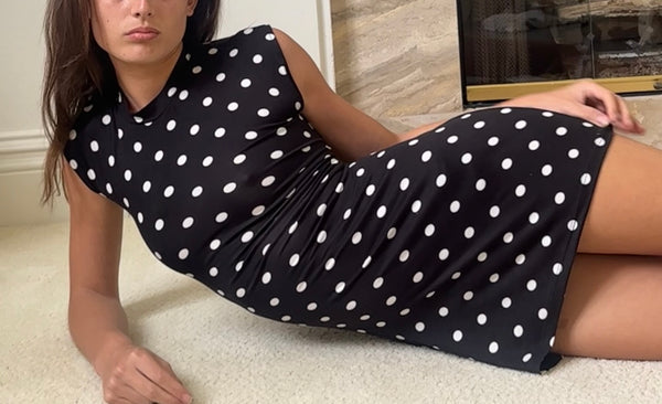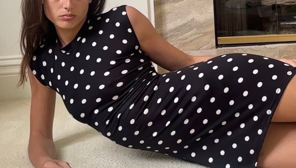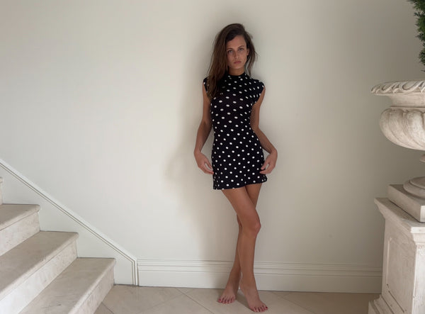 Our signature “Pandora dress”, now in a new dotted soft matte fabric, a summer exclusive. It's slightly see-through with a flattering high neckline and adjustable waist for an hourglass look. Paired perfectly with casual thong heels. Brunch, dinner, any occasion you’re ready to go. Now available in Olive grey brown & black.