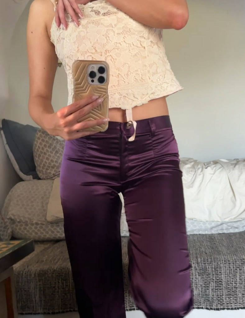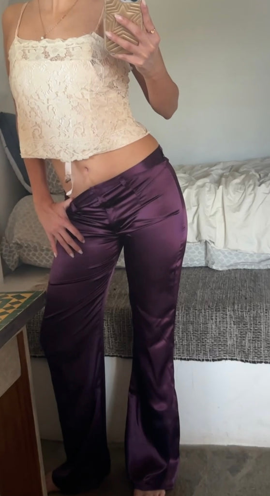 Our low waisted silky pants in a new sexy color, Plum. Ditch the jeans, jazz up your look with fun pants and a basic classic tank of your choice. This is guaranteed to make your night more chic...
